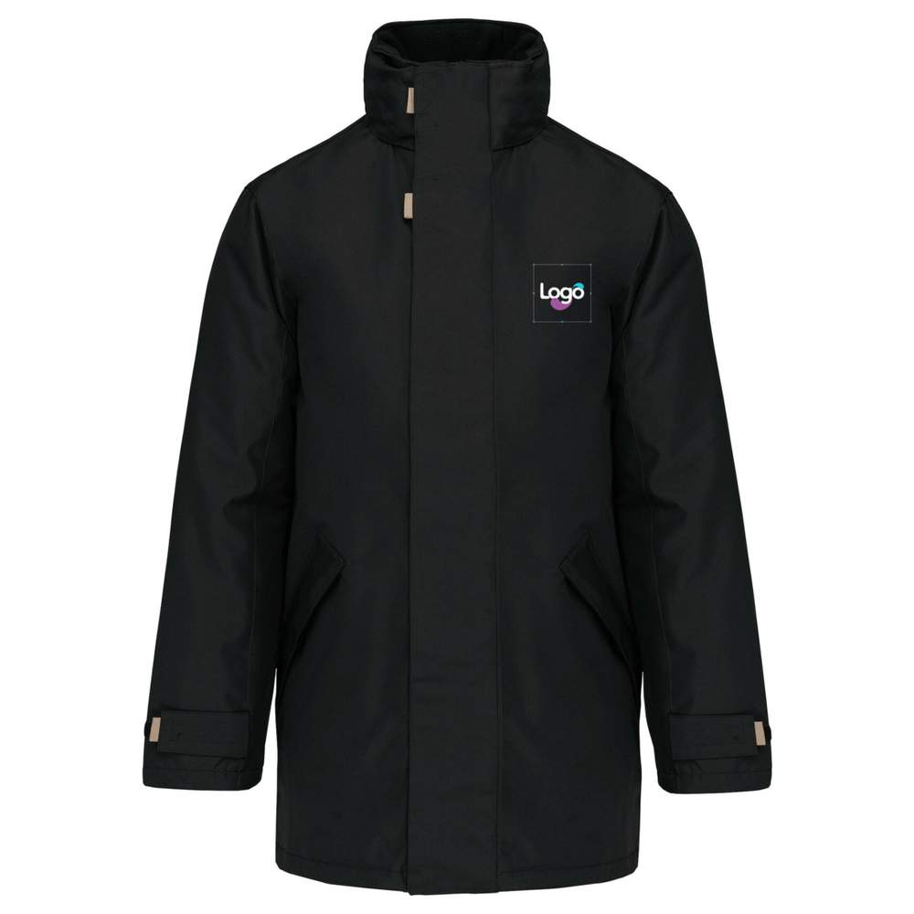 This child parka is made of Oxford polyester, providing durability and protection against the elements. It features a quilted polyester lining for added comfort. The zip closure, combined with a button tab with snap and hook-and-loop fasteners, ensures secure fastening. It has two side zip pockets and two interior pockets, one of which is specifically designed to hold a mobile phone. The hood, integrated into the collar, is lined with fleece for extra comfort. An interior zip allows for easy customization by embroidery, offering the possibility to add your logo or visual.