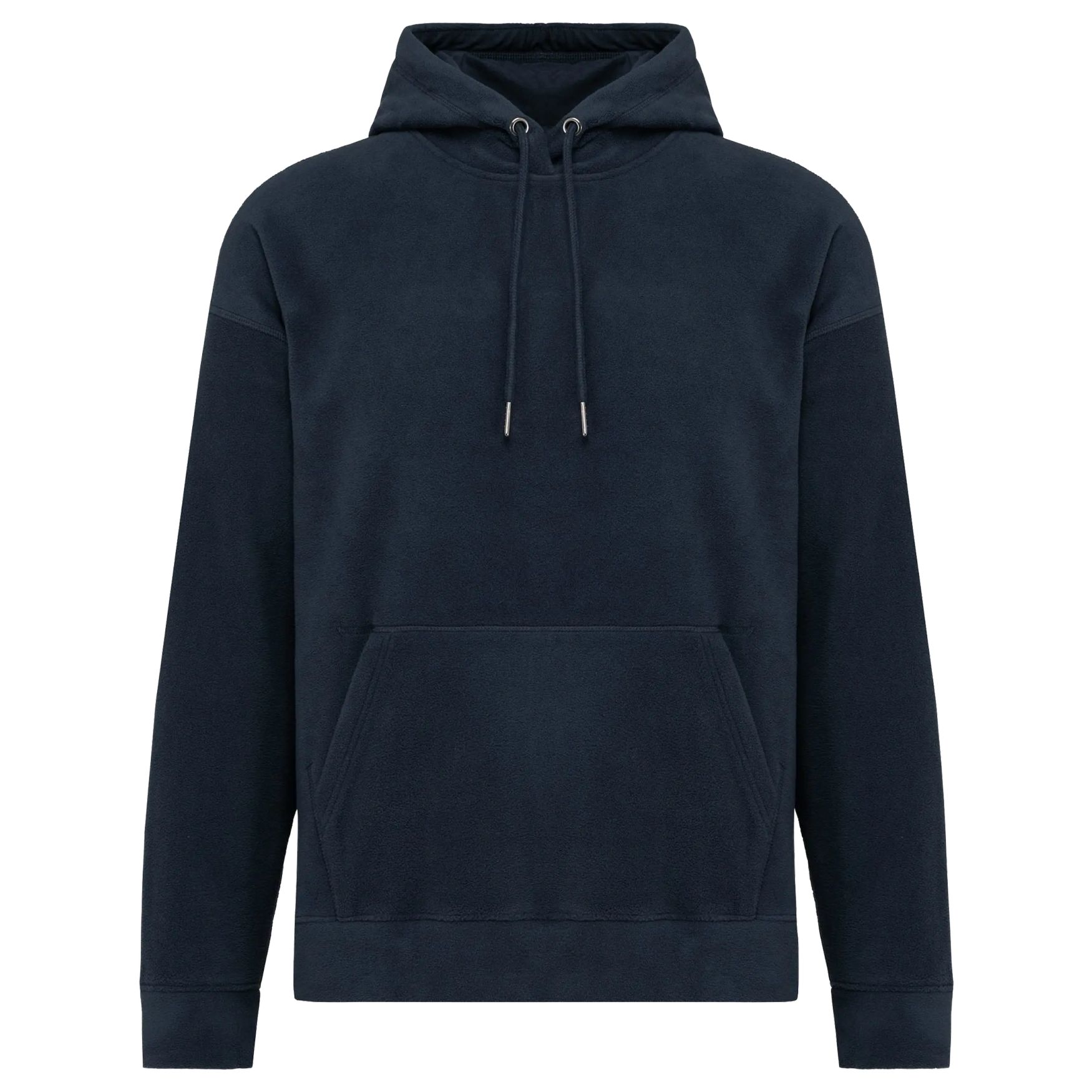 Unisex oversized hoodie in recycled micropolar. This garment features a spacious fit for added comfort. It has practical kangaroo pockets and a hood for extra protection. The micropolar used is designed to resist pilling. This hoodie includes a half-moon back neck finish for easy customization and a clean interior chevron collar. The cuffs and hem are made from the main fabric. It does not have a visible brand label, but a size chip for easy customization.