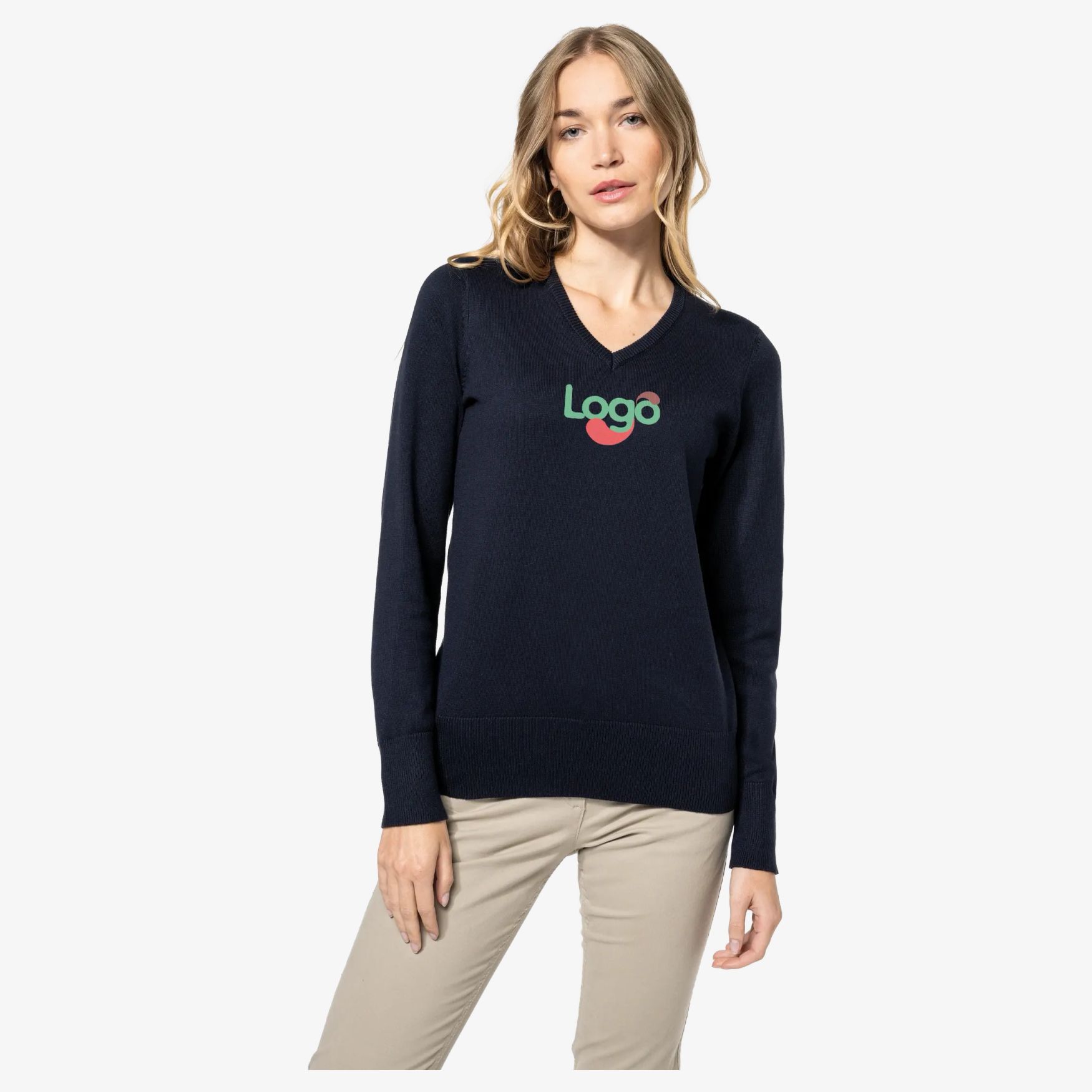 This women's V-neck pull combines comfort and style thanks to its composition of 50% cotton and 50% acrylic. Its fitted cut will highlight your silhouette while ensuring optimal freedom of movement. The double-thickness ribbed edge of the collar adds an extra touch of elegance, while the neckband ensures a perfect fit. This pullover is ideal for creating both casual and sophisticated looks, suitable for all occasions. The possibility to customize this pull with embroidery allows you to add your logo, a pattern or a personal message, for a unique item representative of your identity.