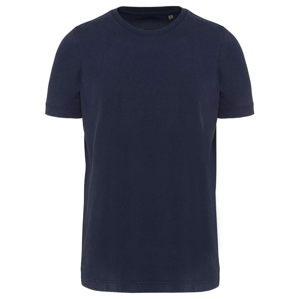 Short-sleeved t-shirt for men, made of cotton. It features a specific treatment for an aged look. The neckline is round and a neck tape is present. The hems of the sleeves and the bottom of the garment are reinforced with a double needle stitch. This model does not have a visible brand label on the collar, but includes a size chip for easy customization. The applied treatment can cause color variations, making each piece unique.