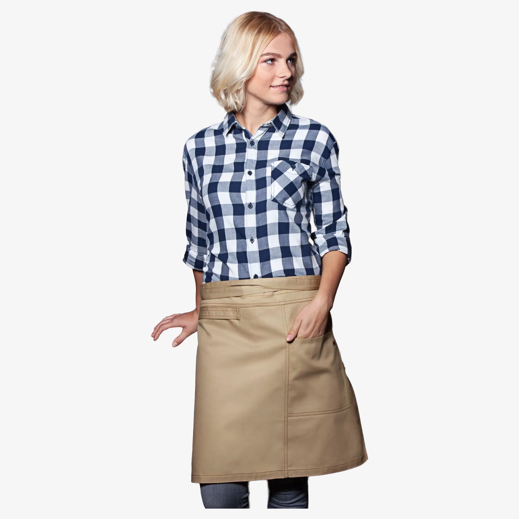 The waist apron Urban Casual-Style is a 100% cotton apron with twill appearance, contrasting seams and bronze-coloured rivets. It includes a left side patch pocket and a fabric loop on the right side for attaching accessories.