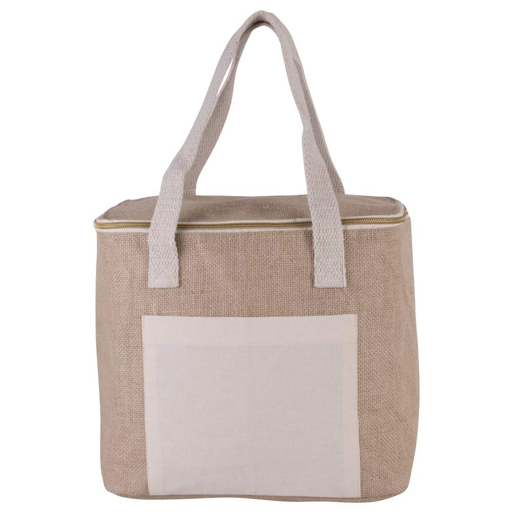 Insulated bag designed to maintain the temperature of food and beverages. The exterior is made of jute fabric, offering a natural and robust appearance. The interior features an insulating wall made of aluminum and high-density thermal foam for better thermal preservation. It is equipped with cotton handles for easy transport. This medium model is suitable for various uses, such as picnics, quick lunches, or grocery transport.