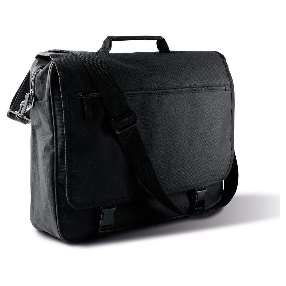 Polyester 600D document case with PVC coating. This model is designed to facilitate the transport of documents. It features a flap with a front pocket and a secure buckle closure. An interior multifunction pocket provides additional storage space. The shoulder strap is removable and adjustable for optimal comfort.