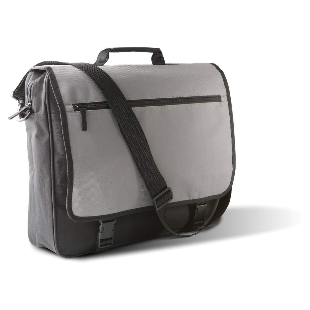 Polyester 600D document case with PVC coating. This model is designed to facilitate the transport of documents. It features a flap with a front pocket and a secure buckle closure. An interior multifunction pocket provides additional storage space. The shoulder strap is removable and adjustable for optimal comfort.