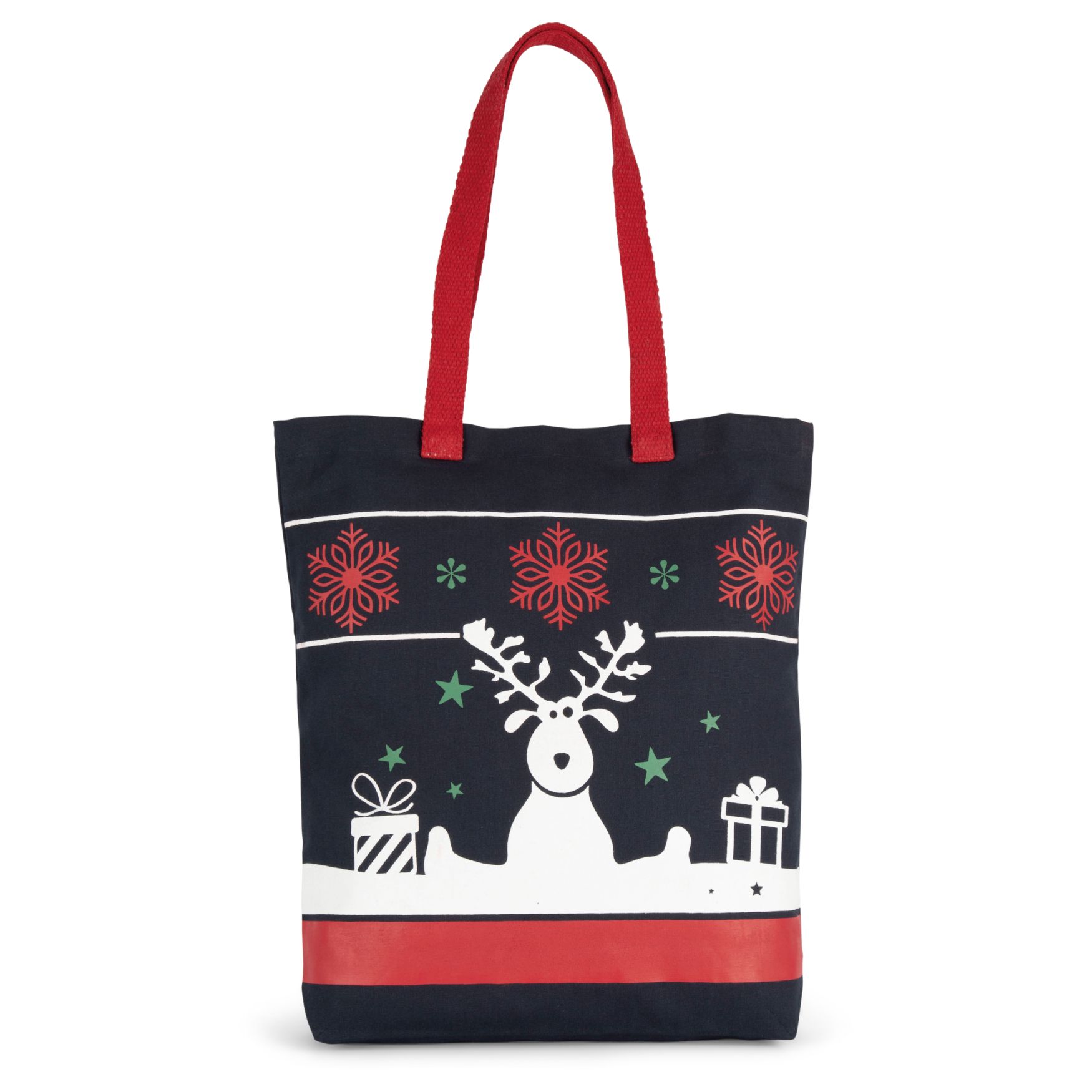 Flat bottom shopping bag, made of cotton, decorated with Christmas patterns. Its dimensions are 38 cm wide, 7 cm deep and 42 cm high. This bag is suitable for carrying groceries or gifts. Its cotton construction gives it a certain robustness for everyday use.