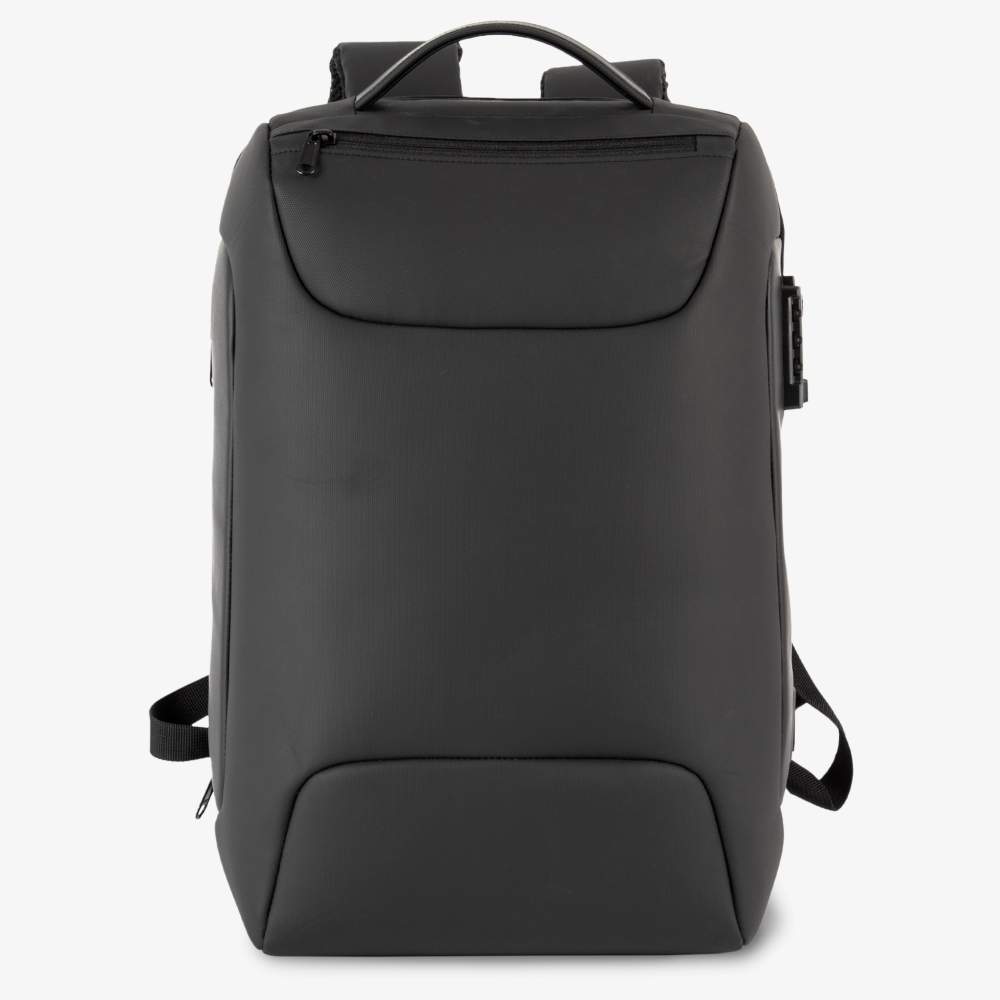This business backpack offers a large main compartment for documents, equipped with a mesh zip pocket and a padded compartment for a laptop up to 15 inches and a tablet. It includes a TSA combination lock to secure the contents. An external USB Type-C connector with an internal cable allows connecting a power bank. A dedicated internal side pocket accommodates the power bank. The bag features a front zip pocket, a side zip pocket for storage, and a back strap to attach it to a trolley. The padded and breathable back and shoulder straps ensure optimal comfort. An invisible pocket on the back allows you to securely store items such as a passport, plane tickets, or phone. The bag's capacity is 18 liters. Composition: 100% polyester.