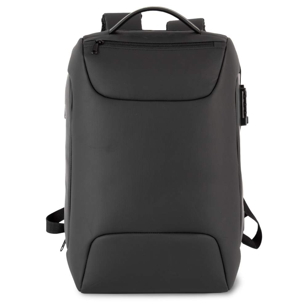 This business backpack offers a large main compartment for documents, equipped with a mesh zip pocket and a padded compartment for a laptop up to 15 inches and a tablet. It includes a TSA combination lock to secure the contents. An external USB Type-C connector with an internal cable allows connecting a power bank. A dedicated internal side pocket accommodates the power bank. The bag features a front zip pocket, a side zip pocket for storage, and a back strap to attach it to a trolley. The padded and breathable back and shoulder straps ensure optimal comfort. An invisible pocket on the back allows you to securely store items such as a passport, plane tickets, or phone. The bag's capacity is 18 liters. Composition: 100% polyester.