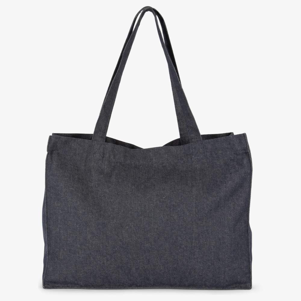 Large recycled denim shopping bag designed to facilitate your daily shopping and travel. Its recycled material gives a second life to textiles, contributing to an eco-responsible approach. The straps, made from the same material as the body of the bag, ensure a good weight distribution and optimal comfort when carrying. The recycled material retains its color over time, ensuring increased durability of the product. This bag offers generous storage space for your purchases, while combining style and functionality.