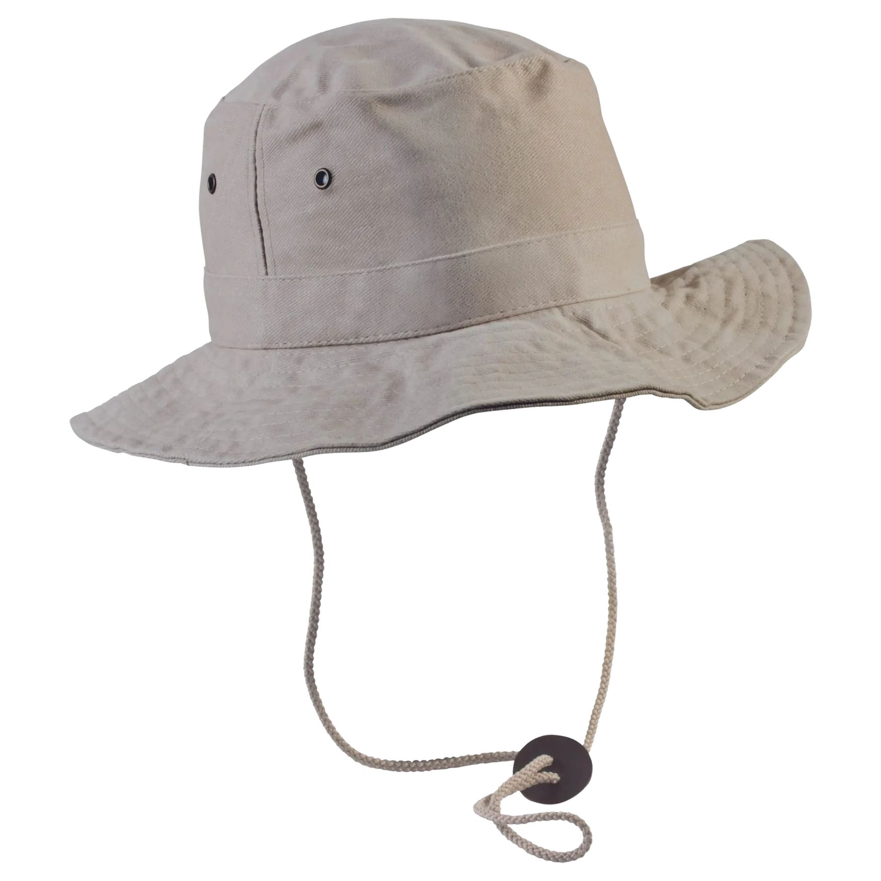 The Baroudeur hat is made of thick brushed twill cotton. It includes a reinforcing band on the crown, a leather strap with stopper for adjustment, and four metal ventilation eyelets.