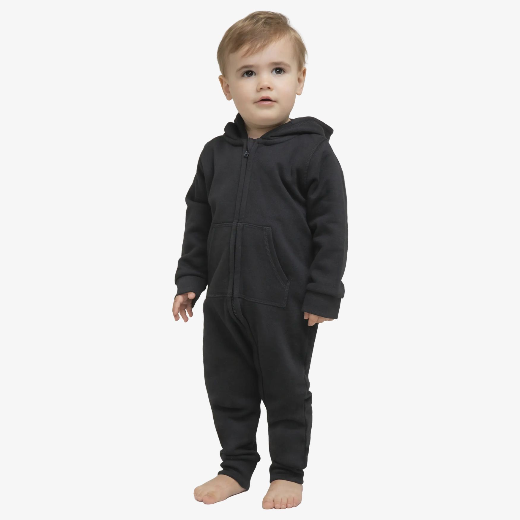 The all in one baby sleepsuit covers the body in a one-piece shape suitable for everyday dressing. It includes a large zip, a kangaroo pocket and a hood with ears. The fabric combines cotton and polyester, with a brushed surface and a soft feel.
