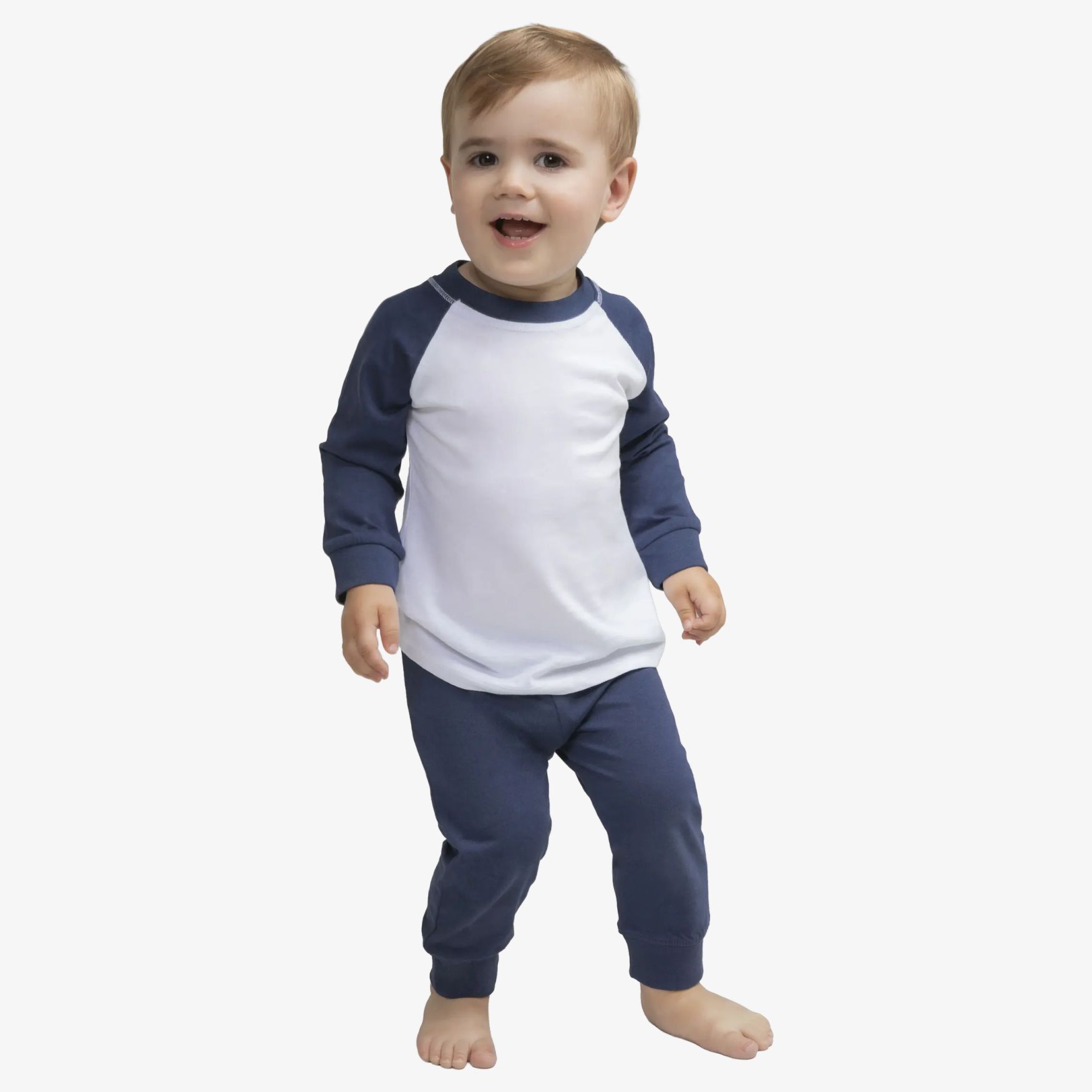 The Children s Pyjamas is a baby nightwear set consisting of a baseball-style tee-shirt with contrasting sleeves and neckline, as well as contrasting trousers with an elasticated waistband. This set is suitable for daily use and makes dressing easier.