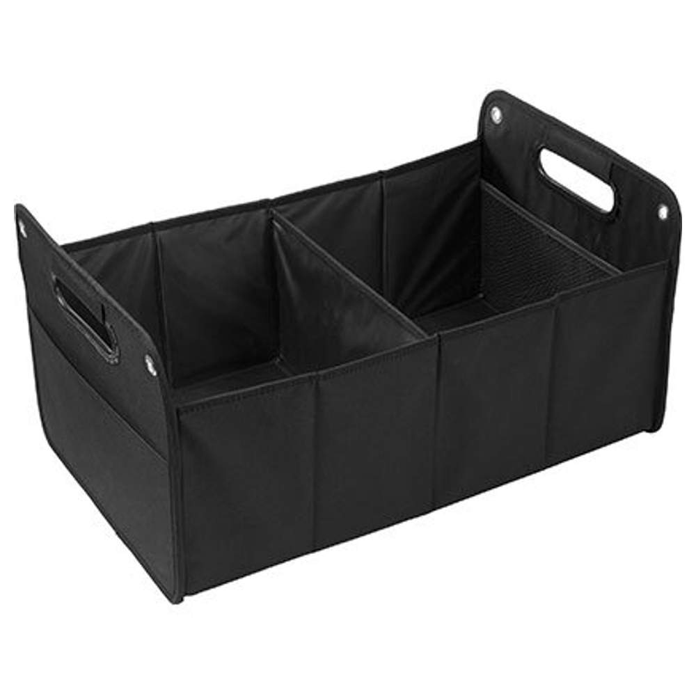 Foldable car organizer designed to facilitate the storage of items inside the vehicle. It has two separate compartments to separate items and a large pocket attached to the front for quick access to small items. The structure is reinforced with metal eyelets at the front and back, allowing for secure fastening. A black elastic band 2.5 cm wide is integrated at the back to ensure stable fastening to the car seat. This organizer is designed to provide a practical and durable solution to keep the interior of the vehicle tidy.