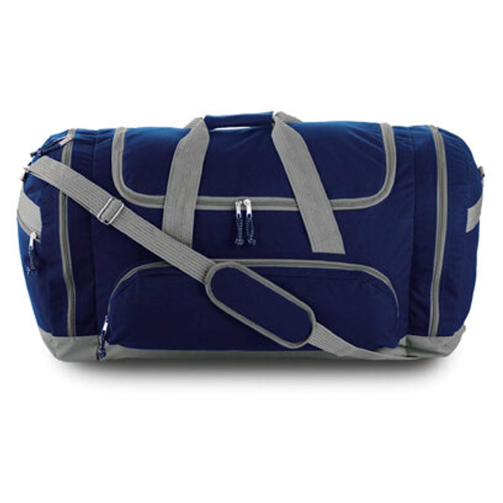Sports bag designed for transporting sports items or equipment. It features three zipped front pockets for easy access to small items. A carrying handle and padded shoulder strap provide comfortable carrying. The zipped closure ensures the security of the contents. This bag is made from polyester, a durable and resilient material.