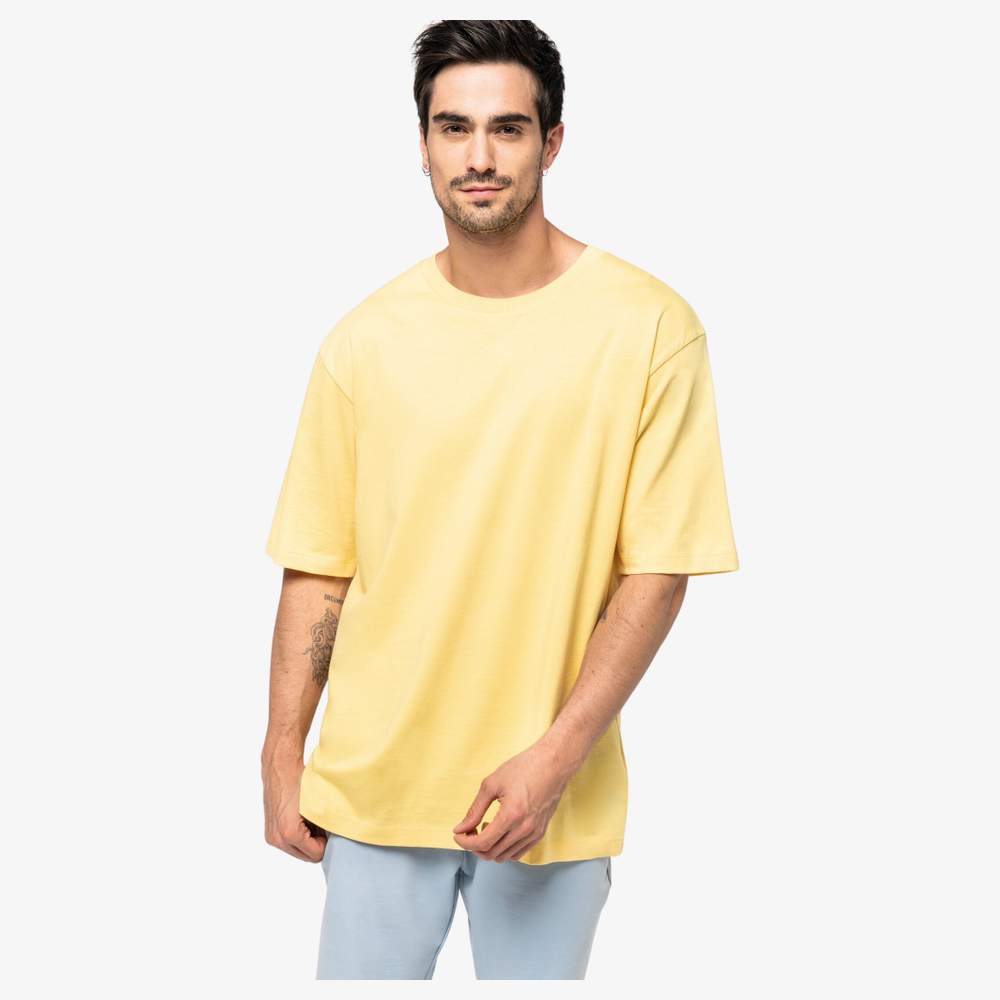 Men's dropped shoulder T-shirt, made of combed ringspun cotton for optimal comfort. Its oversized fit and dropped shoulders give it a relaxed and modern style. Side seams and enzyme wash ensure increased durability and softness to the touch. The double-needle hem at the cuffs and bottom of the garment reinforce the quality and longevity of the product. Its composition of 100% cotton, 90% organic cotton, and 10% recycled pre-consumer cotton demonstrates a commitment to more responsible and sustainable fashion. This T-shirt offers an ideal canvas to express your creativity with the possibility of customizing it with your logo, your visual, or any other graphic element of your choice.
