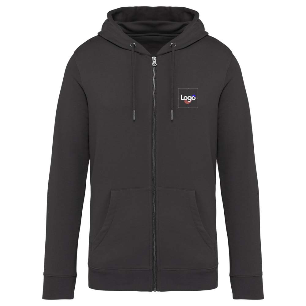 Unisex zipped hoodie in ring-spun combed cotton and recycled polyester. Slim fit, three-needle terry loop for optimal comfort. Metal zipper, half-moon at the back, two practical kangaroo pockets. Rib knit hem at the bottom of the garment and sleeves for better hold. Double stitching on sleeves, armholes and bottom of the garment for greater resistance. Hood lined with main material with cord stop for personalized adjustment. Round cords with tips and eyelets in recycled metal for an eco-friendly touch. Interior chevron waistband for added comfort. Composition: 85% organic cotton, 15% post-consumer recycled polyester.