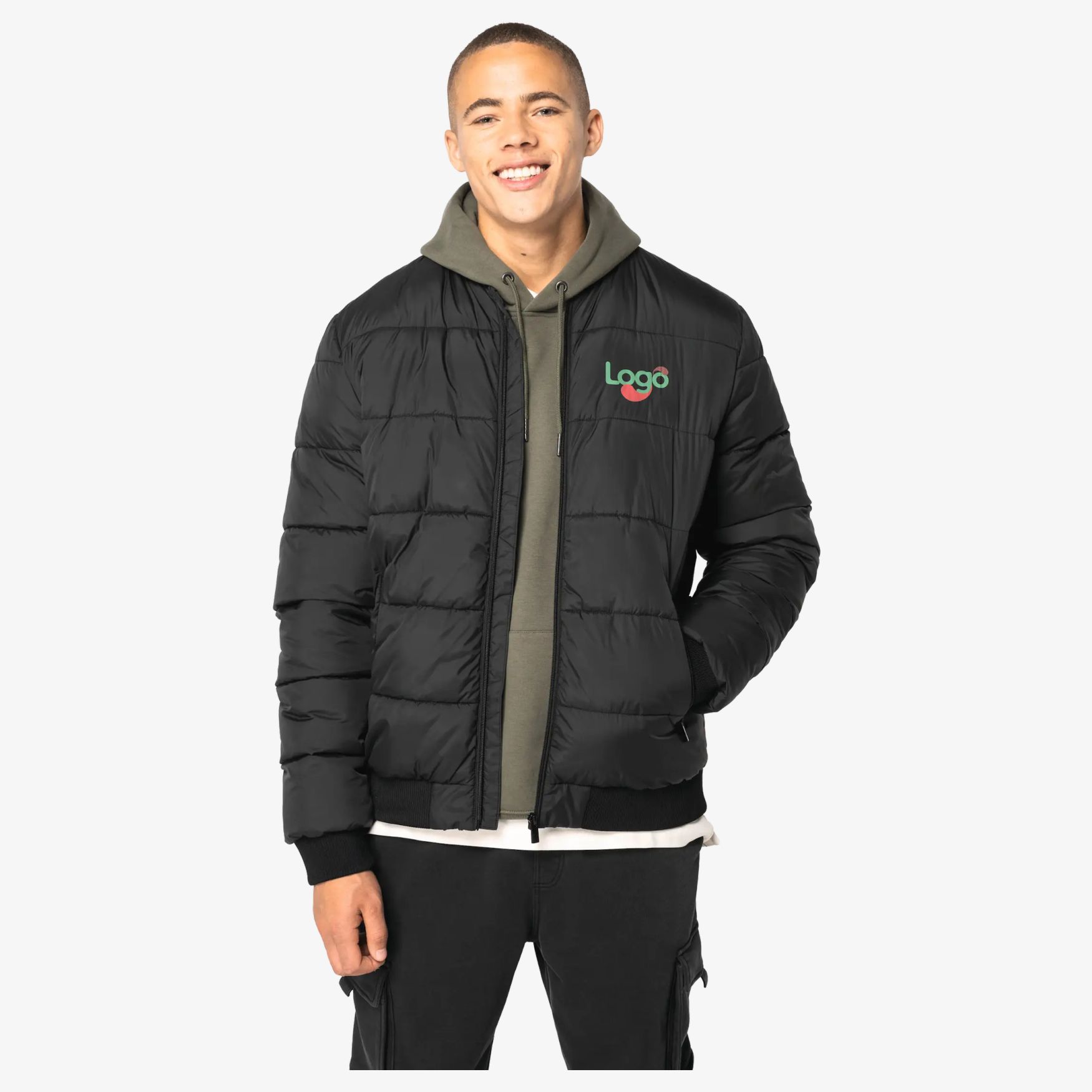 The Veste Matelassée à col Teddy Unisexe is a quilted jacket in pongee polyamide, standard fit, with coated fabric. The padding is made from post-consumer recycled polyester. Teddy collar and tone-on-tone 2x2 ribbing at the collar, sleeve cuffs and hem. Front zip fastening, front pockets and a zipped piped inner pocket on the heart side. Area intended for customization.