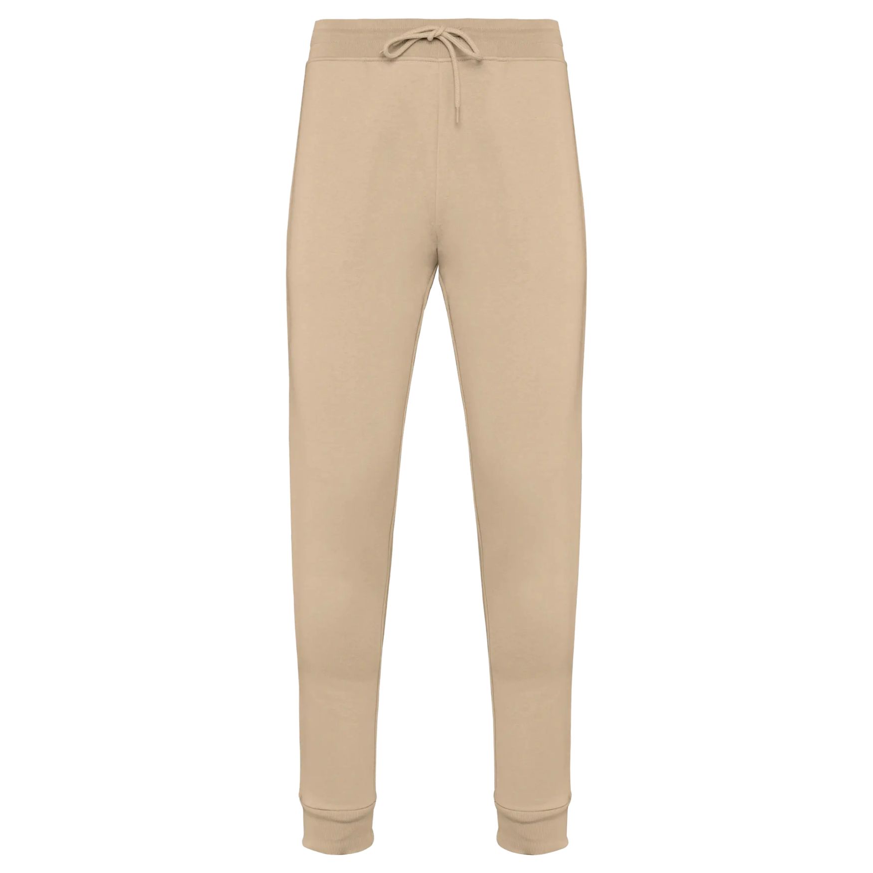 Men's jogging pants made of 3-thread brushed LSF fleece (Low Shrinkage Fleece). Features a 1x1 rib waistband with drawstring eyelet buttonhole, side pockets and a piped back pocket. Leg hems in 1x1 rib. Composition includes 85% organic combed ringspun cotton and 15% post-consumer recycled polyester.