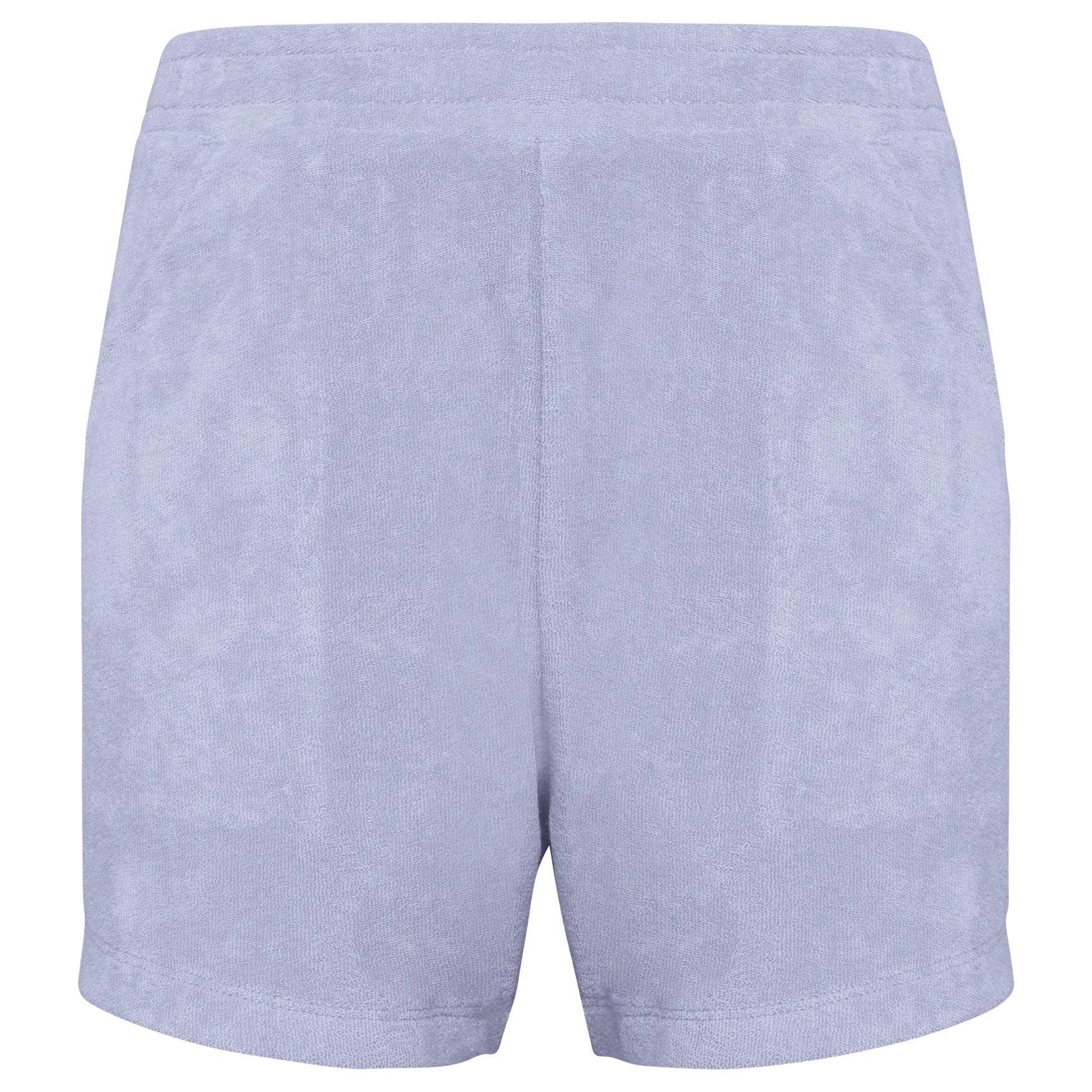 The terry shorts for girls combine combed cotton and terry fabric. The waistband is made of main material with elastic waist. The garment features two side pockets with topstitching at the opening. The hem is double topstitched.