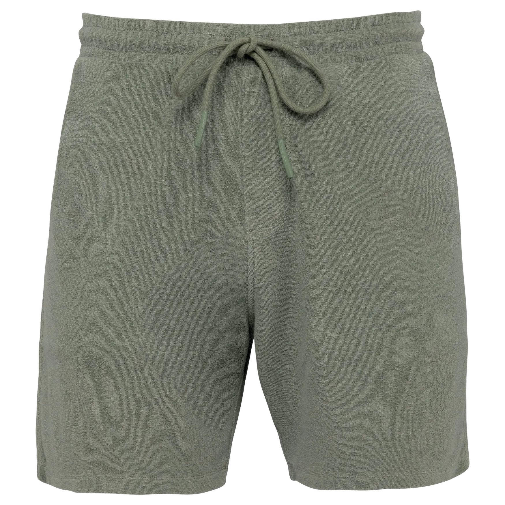 The men's towel terry shorts are made of 80% organic cotton and 20% post-consumer recycled polyester. These terry fabric shorts include an elastic waistband with drawstrings and a decorative false fly. A patched pocket is positioned at the back. Colors may vary depending on the product due to washing after assembly.