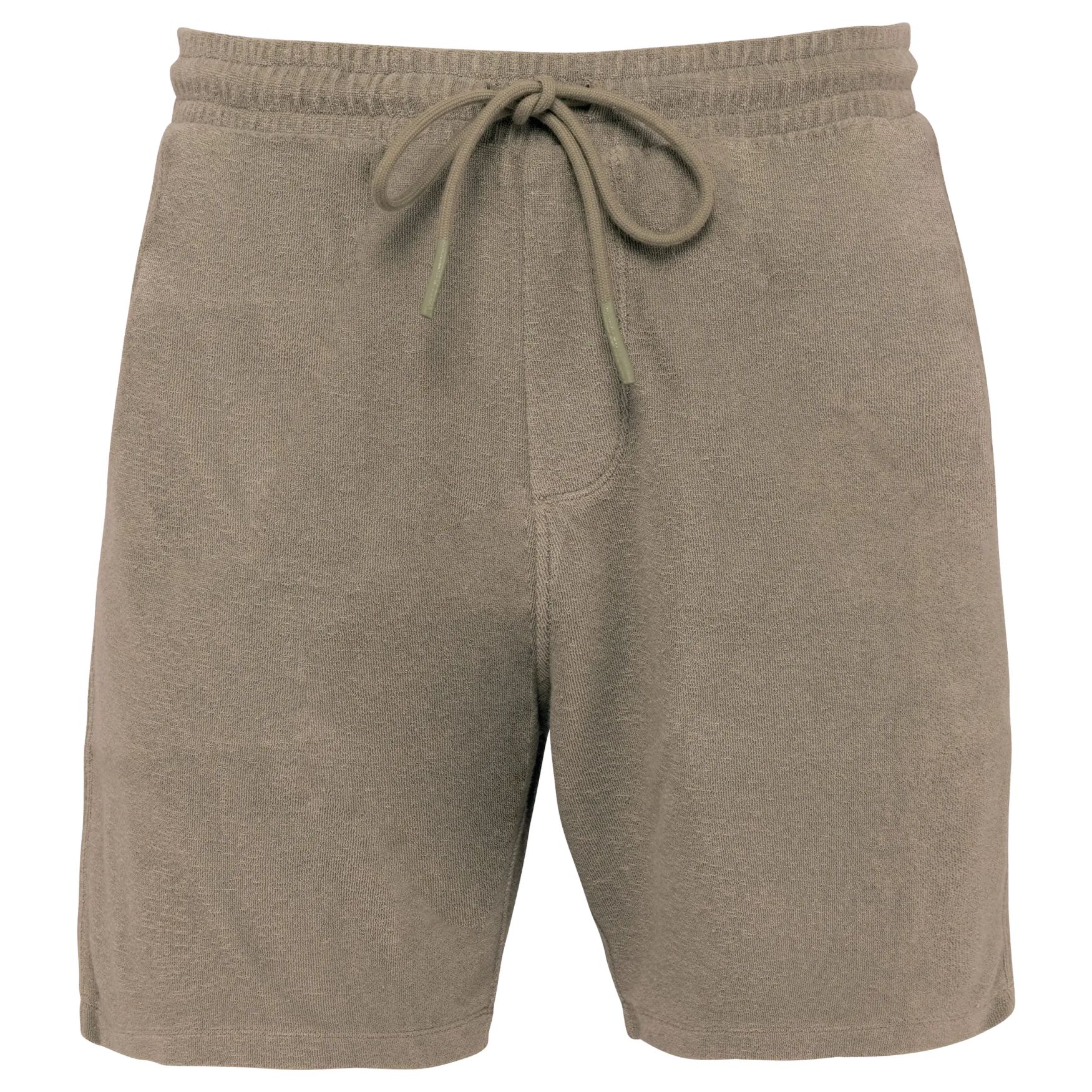 The men's towel terry shorts are made of 80% organic cotton and 20% post-consumer recycled polyester. These terry fabric shorts include an elastic waistband with drawstrings and a decorative false fly. A patched pocket is positioned at the back. Colors may vary depending on the product due to washing after assembly.