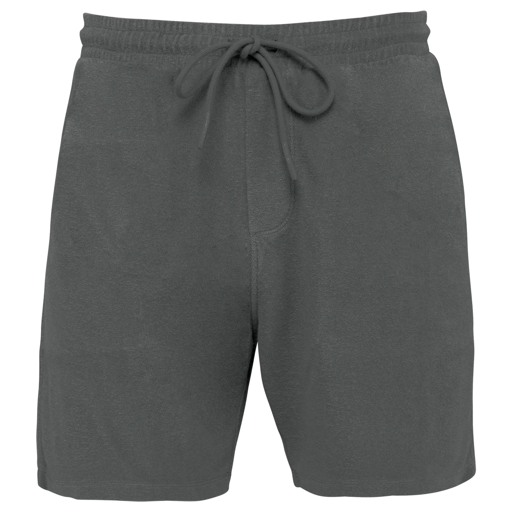 The men's towel terry shorts are made of 80% organic cotton and 20% post-consumer recycled polyester. These terry fabric shorts include an elastic waistband with drawstrings and a decorative false fly. A patched pocket is positioned at the back. Colors may vary depending on the product due to washing after assembly.
