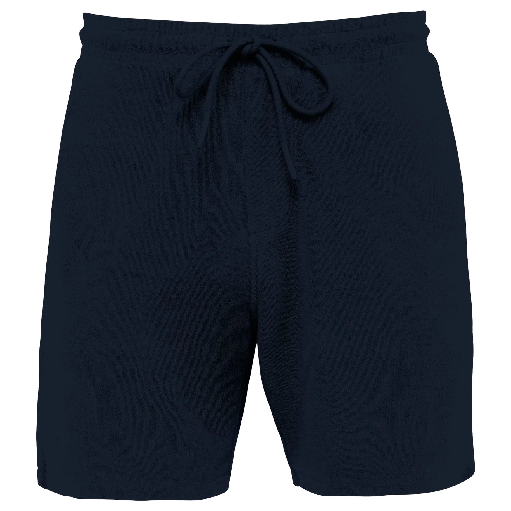 The men's towel terry shorts are made of 80% organic cotton and 20% post-consumer recycled polyester. These terry fabric shorts include an elastic waistband with drawstrings and a decorative false fly. A patched pocket is positioned at the back. Colors may vary depending on the product due to washing after assembly.