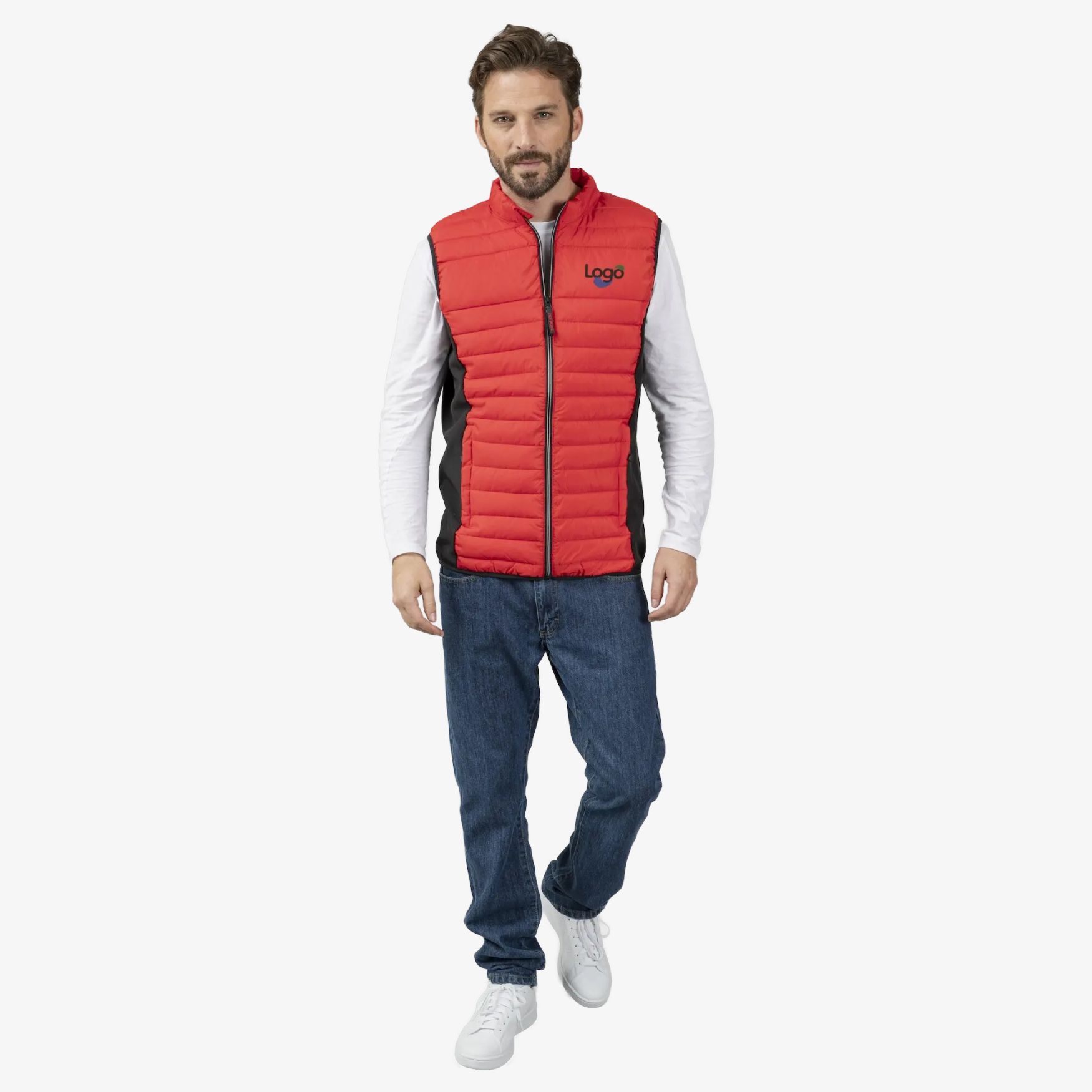 Modern lightweight bi-material bodywarmer designed to offer comfort and functionality. It features two side zip pockets for practical storage and a chin guard for added comfort. The contrasting zips add a touch of style. The composition includes a polyester 300T quilted body and sides in 96% polyester, 4% elastane, offering a balance between warmth and freedom of movement. This bodywarmer is also customizable, allowing the addition of your logo or graphic elements for a unique brand image.