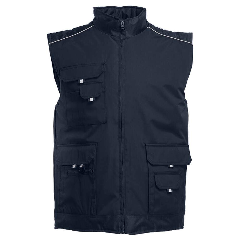 Polyester padded vest designed to offer comfort and protection. Its high-quality microfiber construction ensures good thermal insulation and increased resistance. Oxford 330D reinforcements strengthen wear areas, including shoulders, collar, and front lower part. The padded polyester lining provides additional insulation. This vest offers effective protection against bad weather thanks to its waterproof and windproof properties. It features eleven exterior pockets for practical and secure storage: one front zip pocket, four hook-and-loop pockets, two side pockets, three pen pockets, and one phone pocket. Reflective strips on the pockets and shoulders improve visibility in low light conditions. Fabric: 100% polyester microfiber Reinforcements: Oxford 330D Lining: Padded polyester Number of pockets: 11