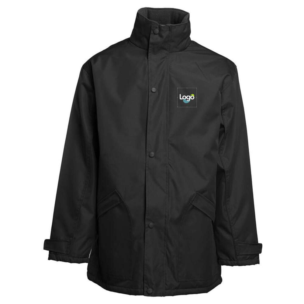 100% nylon oxford waterproof parka, offering effective protection against the elements. Its quilted polar fleece lining ensures optimal thermal comfort. The polar fleece-lined collar enhances insulation. The sleeves are equipped with self-fastening strips for a precise fit. It has two zippered exterior pockets for storing your personal items and two interior pockets for easy access. Access is provided for customization, allowing you to integrate your logo or your visual. This parka is designed to meet customization and branding needs.