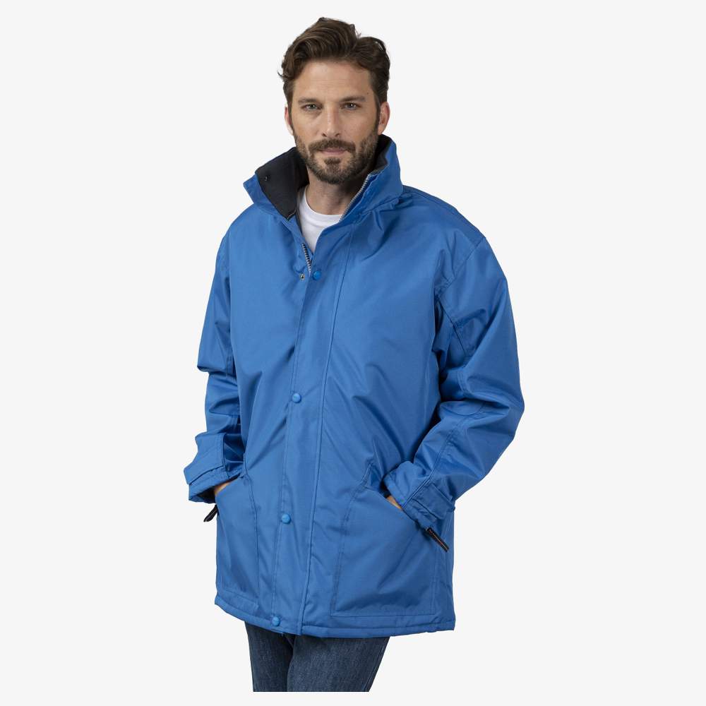 100% nylon oxford waterproof parka, offering effective protection against the elements. Its quilted polar fleece lining ensures optimal thermal comfort. The polar fleece-lined collar enhances insulation. The sleeves are equipped with self-fastening strips for a precise fit. It has two zippered exterior pockets for storing your personal items and two interior pockets for easy access. Access is provided for customization, allowing you to integrate your logo or your visual. This parka is designed to meet customization and branding needs.