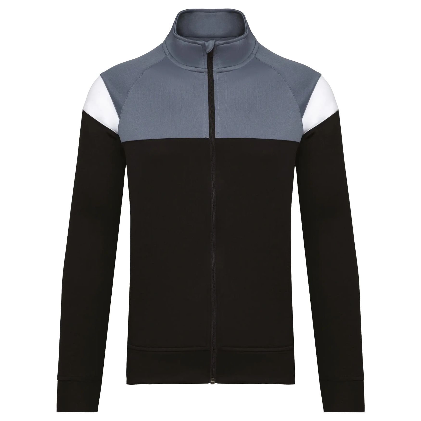 The unisex tracksuit jacket is made of matte interlock polyester, featuring a straight cut with front closure by tone-on-tone nylon reverse zipper. It has raglan sleeves with contrast inserts on the shoulders and a contrast chest shoulder cut. Two zipped pockets are located at the front, while textured fabric inserts are on the back sides. The collar includes a zipper cover for comfort and a detachable label facilitates customization.