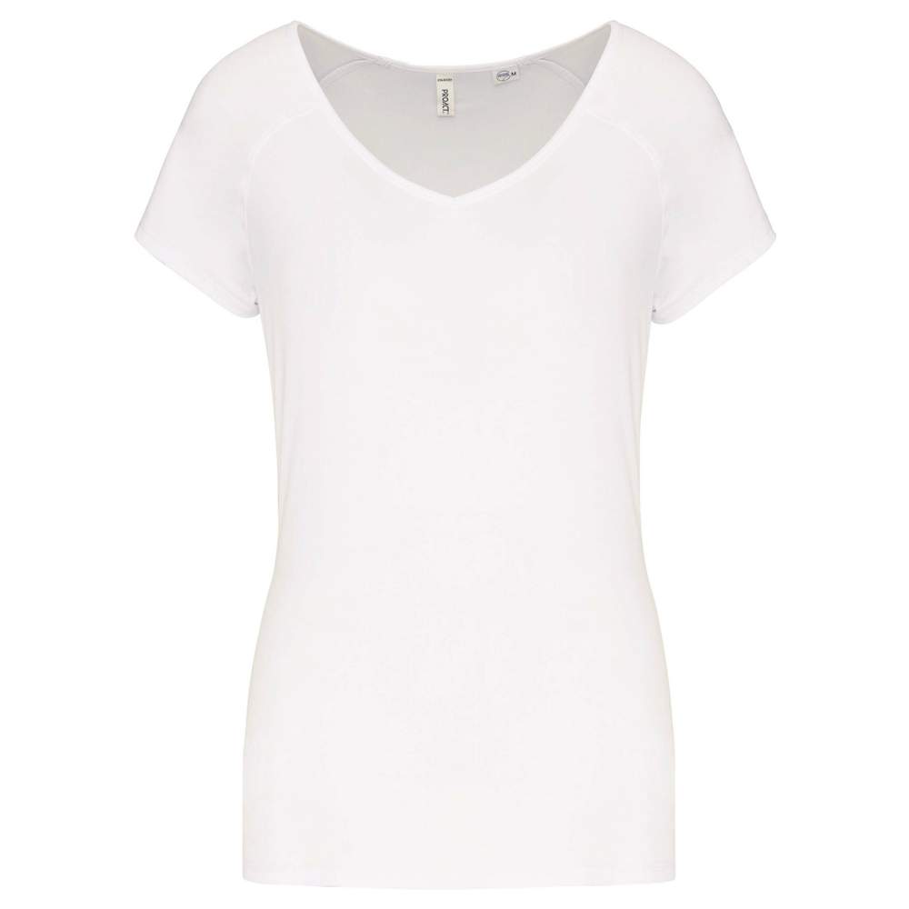 Eco-friendly sports t-shirt for women. This t-shirt features a slim fit and a V-neck with a ribbed finish. Raglan sleeves provide increased freedom of movement. The seams are constructed with an overlapping stitch at the neckline, armholes, sleeve hems, and garment hem. A size chip is integrated at the neckline. The brand label is designed to be easily removable for customization.