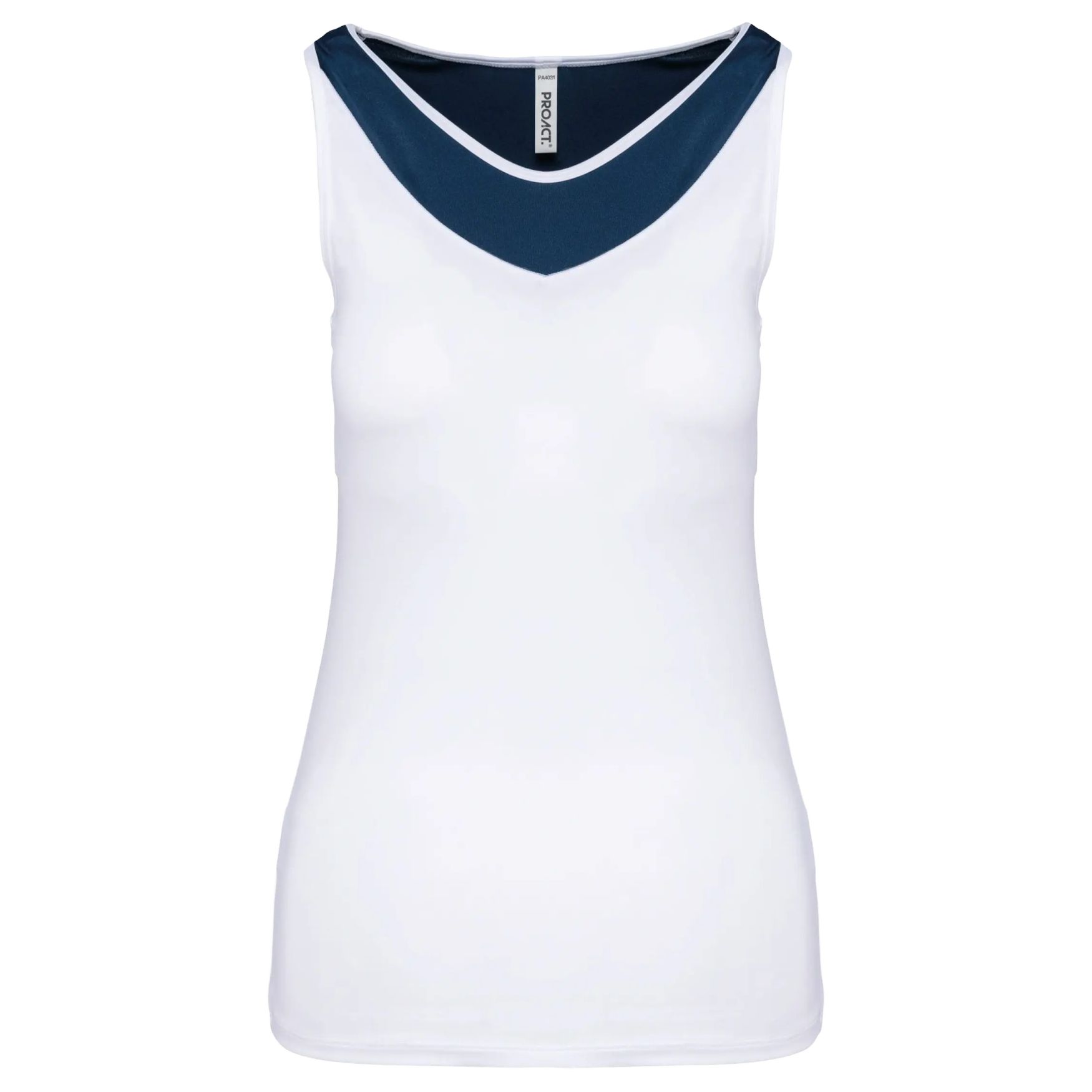 The women's two-tone padel tank top is made of jersey mesh fabric with a slim fit and deep neckline. The bias finish on the neckline and armholes is done with a double needle. This garment includes contrast inserts.