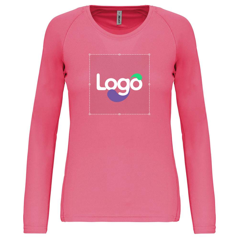 This long sleeve sport t-shirt for women is made of 100% polyester, offering a lightweight and quick-drying fabric for optimal comfort during your sports activities. It features a round neck with an integrated clean band, as well as raglan sleeves for increased freedom of movement. The armholes and cuts are reinforced with a coverstitch, ensuring increased durability. The careful finishes include a double needle at the neckline, sleeve hems, and garment hems. This t-shirt is also customizable, allowing you to add your logo or your visual for a unique touch.