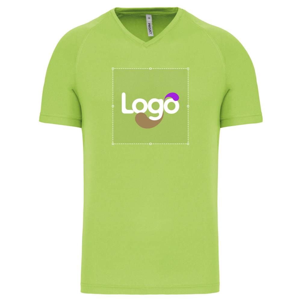 This short-sleeved v-neck sport t-shirt is designed to offer comfort and performance. Made of 100% polyester, it provides quick drying, ideal for your sports activities. The V-neck with a clean band offers optimal hold, while the raglan sleeves and coverstitches ensure increased freedom of movement. The double-stitch hem at the bottom of the sleeves and garment ensures enhanced durability. This t-shirt is also customizable, allowing you to add your logo or visual for a unique brand image.