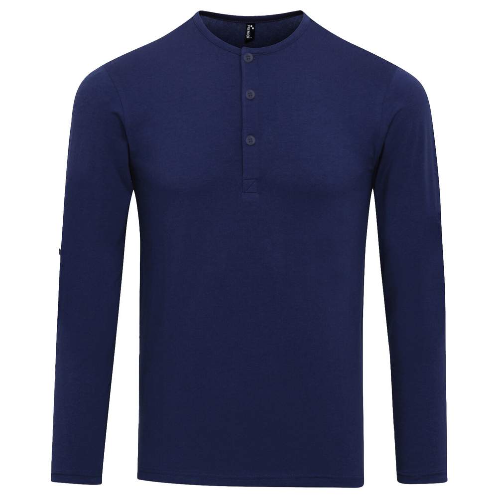 Long-sleeve t-shirt for men with roll-up sleeves and a 3-button collar. The sleeves can be rolled up and secured with a button and button tab. Round collar with a 3-button tab. Ribbed edge at the collar and cuffs. Soft and stretchy fabric for optimal comfort. This t-shirt offers customization options to meet your specific needs.