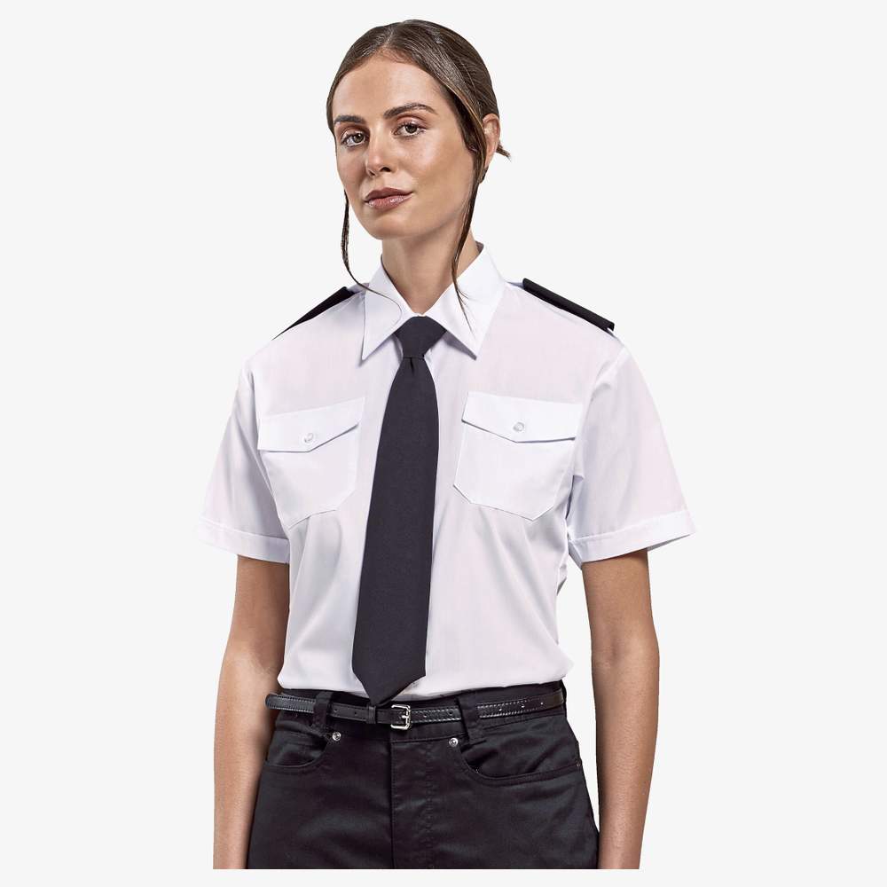 Short-sleeved pilot shirt for women. Classic cut, reinforced collar for optimal hold. It features two chest pockets with flaps, offering practical storage space. A pen pocket is combined on the left chest pocket. Shoulder tabs allow adding shoulder pads (reference PR715). Easy to maintain and iron, this shirt is designed for everyday comfort.