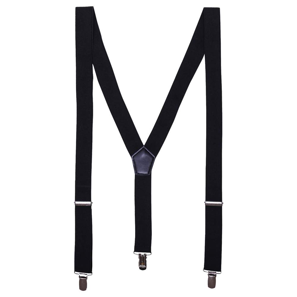 Elastic Y-shaped suspenders designed to provide optimal support while complementing an outfit. They are equipped with three anti-slip clips for secure fastening to the trousers. The fully adjustable design allows for customizable length for personalized comfort. A faux leather decoration adds a touch of discreet elegance. Composition: 60% polyester, 40% rubber. Number of clips: 3. Shape: Y