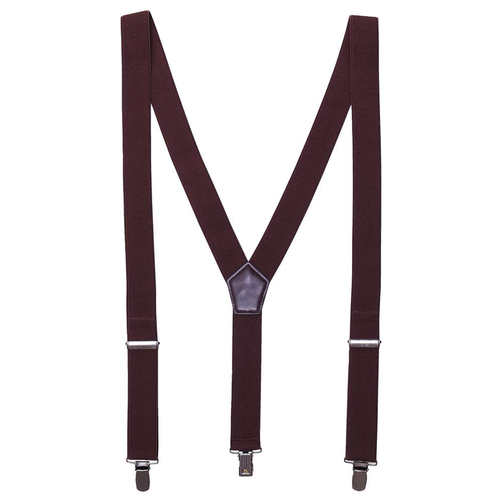 Elastic Y-shaped suspenders designed to provide optimal support while complementing an outfit. They are equipped with three anti-slip clips for secure fastening to the trousers. The fully adjustable design allows for customizable length for personalized comfort. A faux leather decoration adds a touch of discreet elegance. Composition: 60% polyester, 40% rubber. Number of clips: 3. Shape: Y