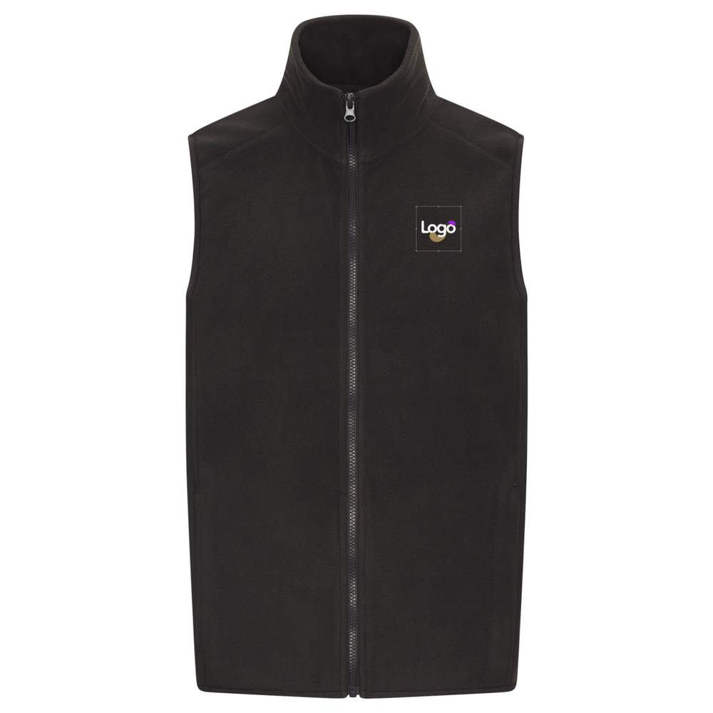 This sleeveless polar vest offers a comfortable and practical standard cut. It features a full front zip and zip pockets for secure storage. The decorative twin-needle stitching adds a stylish touch. This unisex model is designed for versatile use. It is made of 100% polyester. Possibility of customization with embroidery to display your logo or visual.
