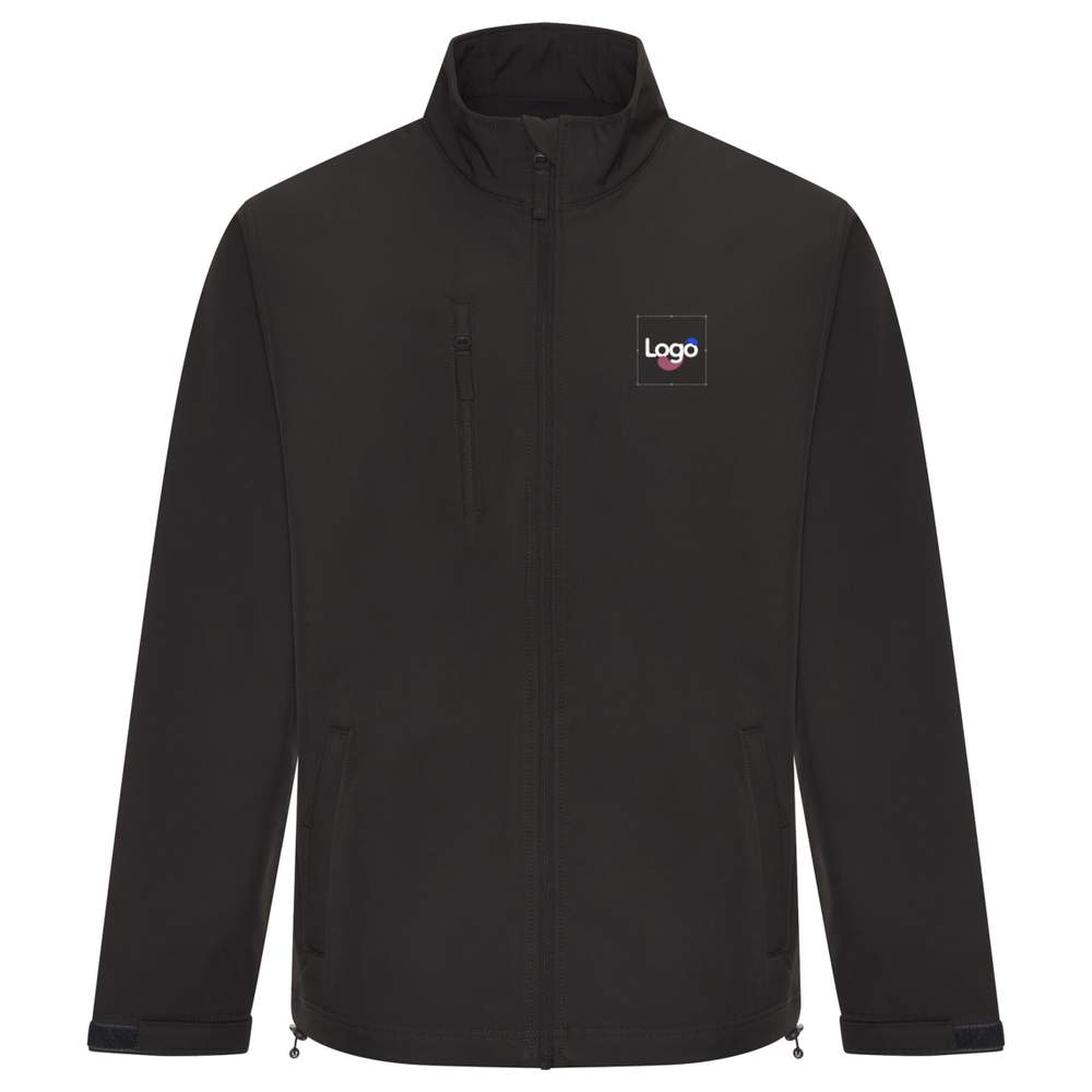 Standard softshell jacket with standard cut. It features a full-length zip front, side pockets, and a zippered chest pocket. This three-layer softshell fabric offers protection against wind and showers. It is equipped with a chin guard, an inner storm flap, and an adjustable drawstring hem. Customization option with embroidery to add your logo or visual. Composition: 97% polyester, 3% elastane.