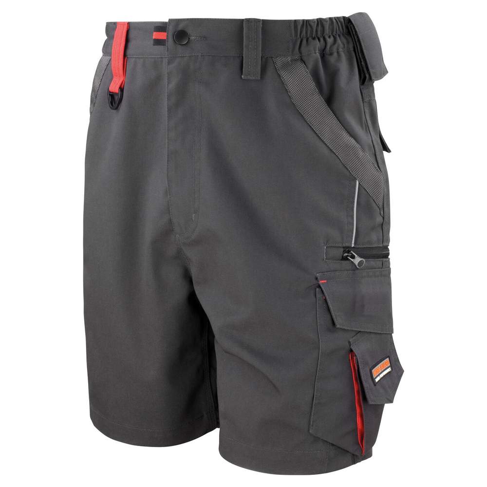 This technical work short is designed to offer comfort and functionality to professionals. It is made from a blend of polyester and cotton, offering good resistance and easy maintenance. It features 2 side pockets, a multi-use cargo pocket, and rear pockets for practical storage. The elasticated waist and belt loops ensure a comfortable and personalized fit. The black contrasting panels and red sewn finishes add a touch of style. The contrasting fabric is 100% polyester.