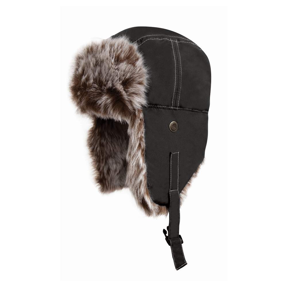 Textile sherpa hat. It is designed to offer comfort and protection against the elements. Its composition of polyester and acrylic ensures a soft feel while being waterproof and quick drying. The design allows it to be pulled up to the top of the head. Metal eyelets are present at ear level, as well as a plastic clip closure.