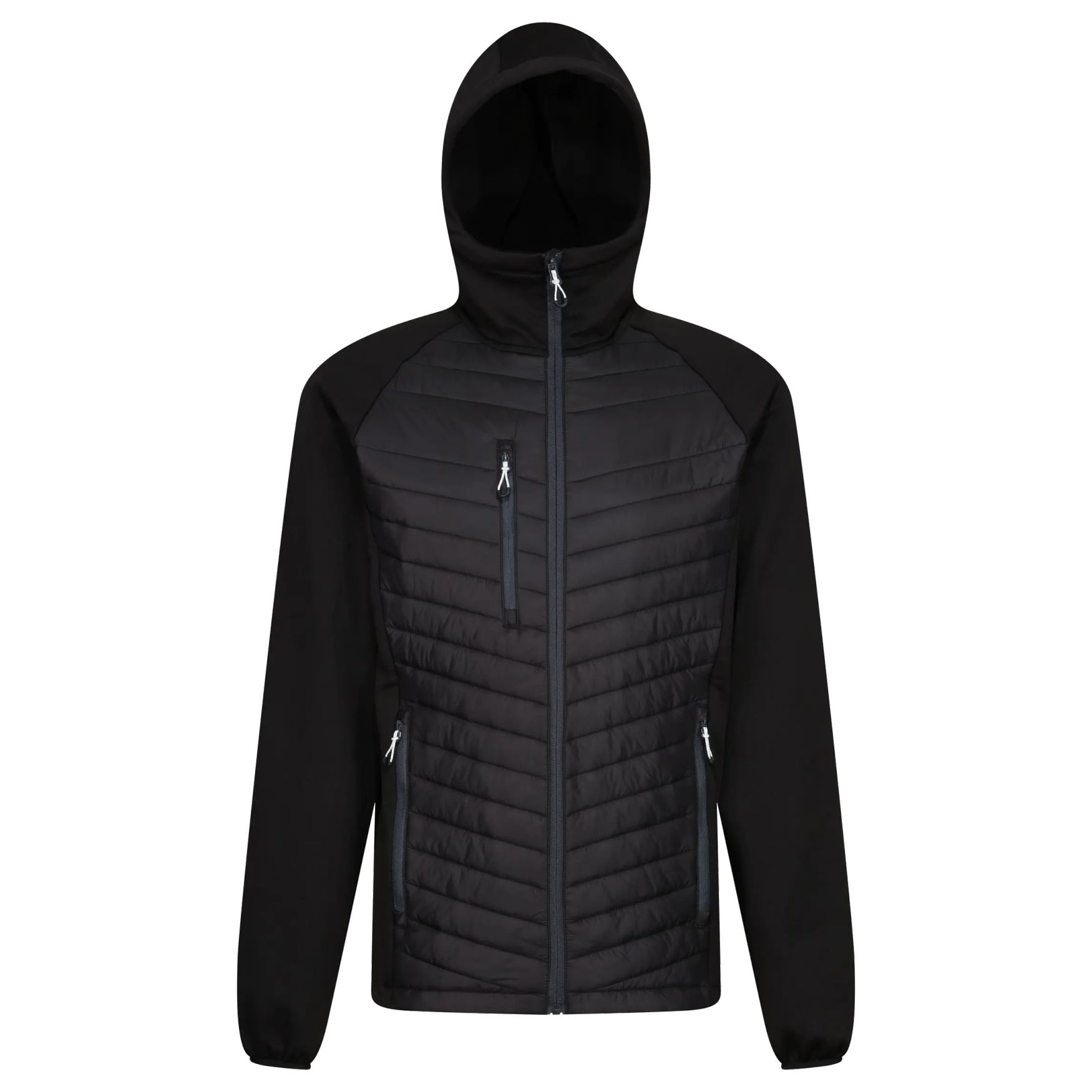 The Navigate Hybrid Jacket is a two-material padded jacket with a polyamide body, lightweight recycled padding, DWR finish, hood and stretch panels on the sleeves and sides for ease of movement. The zipped front and chest pockets make it easy to store personal belongings.