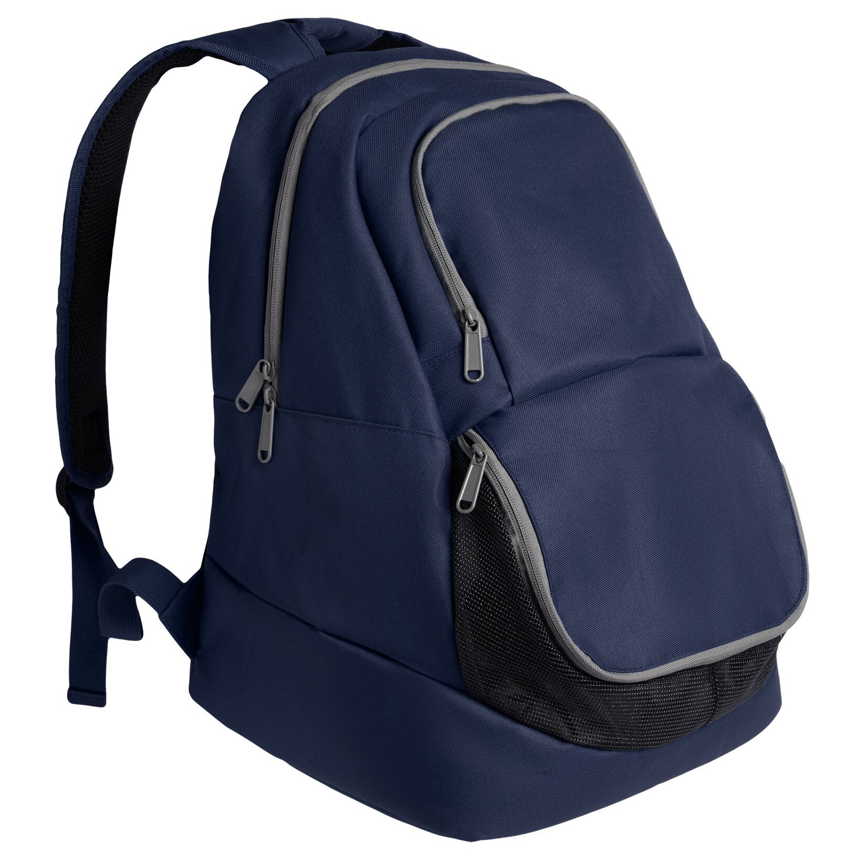 Sports backpack with an ergonomic design. Reinforced double shoulder straps and special handle. Padded back. Front-access shoe pocket. One main compartment with double zipper and a smaller front exterior pocket. Contrasting gray zippers. Black details. Detachable tag. Water-resistant. Capacity 38 L. Composition: 100% polyester 900D. This backpack is customizable with embroidery or by printing your logo, for maximum brand visibility.