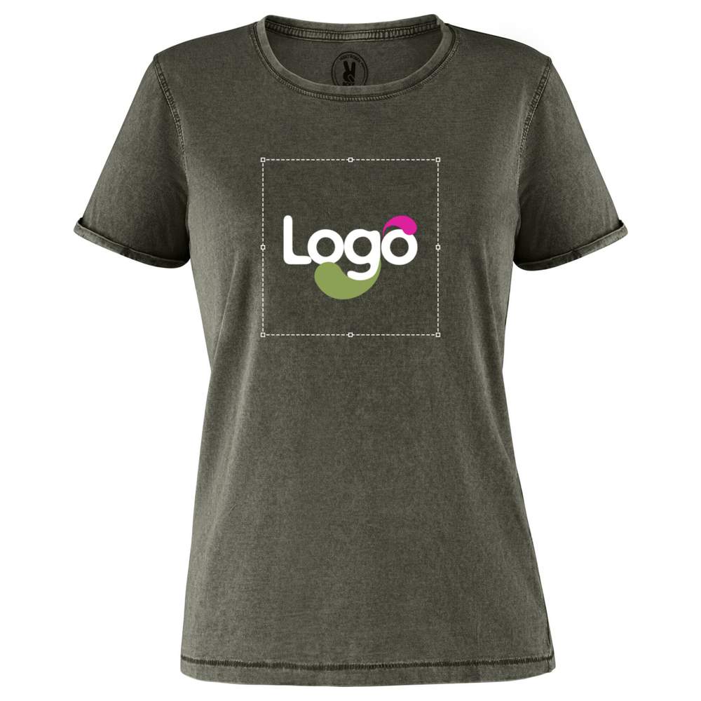 Short-sleeved women's T-shirt with jeans effect. Round neck ribbed 1x1, with shoulder-to-shoulder clean band. Double stitching on armholes. Opening on the sleeves with hem. The finish and tone of this piece can vary while being from the same order. Adhesive label. Duo concept. Composition: 100% combed cotton. This T-shirt is ideal for customization and adding your logo or visual.