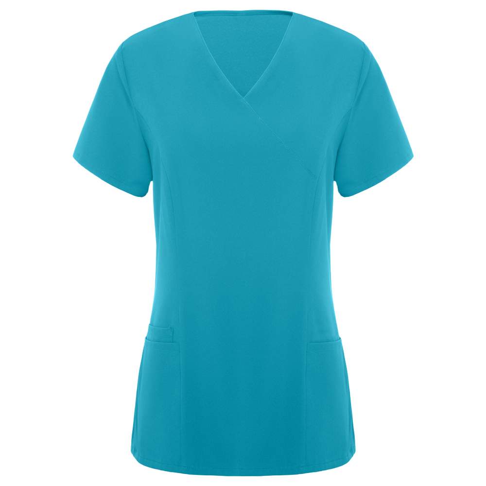 Short-sleeved blouse for women. Crossed V neckline. Two French pockets. Detachable label. Composition: 94% polyester, 6% elastane. Blouse to combine with the FIBER pants.