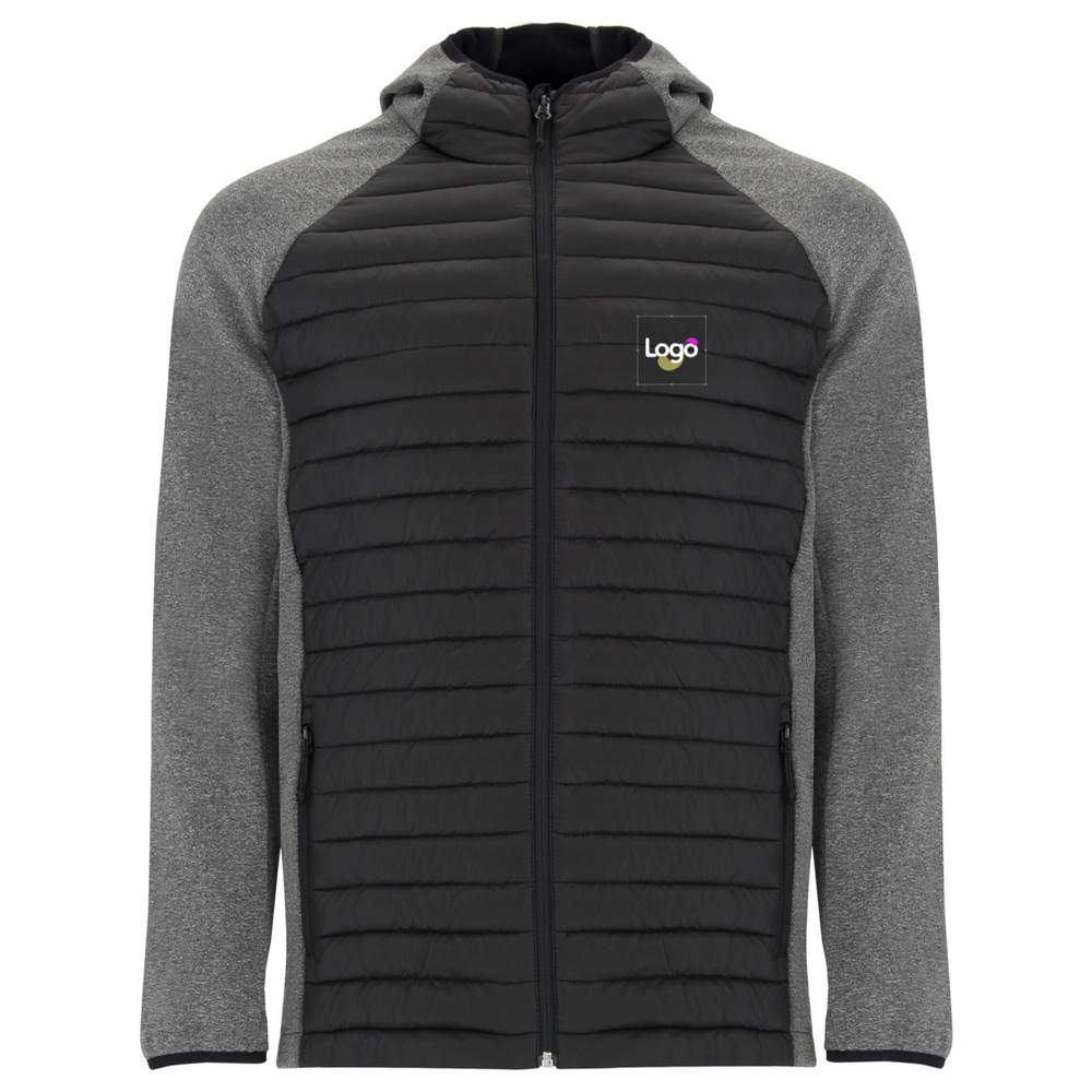 The Minsk jacket by ROLY SPORT is designed by combining two fabrics for optimal comfort. It features an adjustable fixed hood and raglan sleeves. The softshell fabric is used for the sleeves, side panels, and hood, while the front and back are padded with a down-touch material. It is equipped with a zipper ton-on-ton with chin protection and slider, as well as two front zipped pockets. An elastic ton-on-ton piping is present at the neck, wrists, and bottom of the jacket. The label is detachable and the model is windproof.