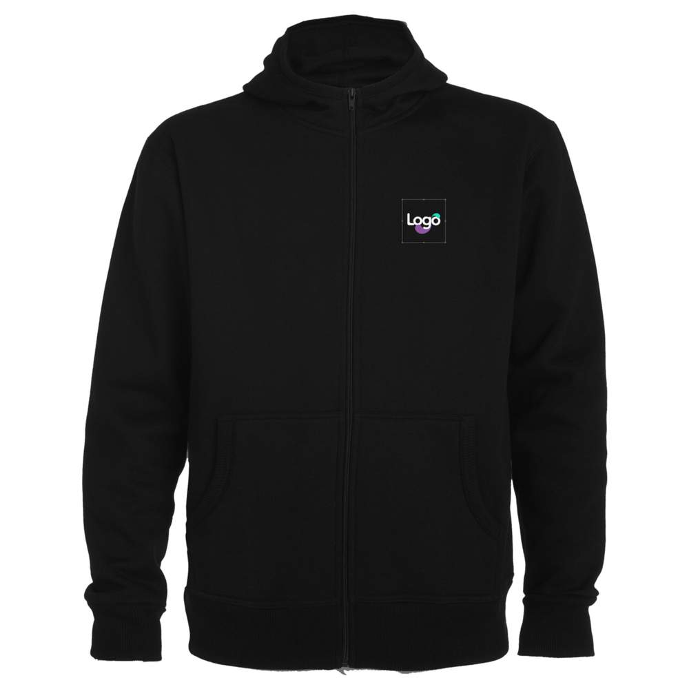 Relaxed hooded sweatshirt with zip closure. Ribbed finish on the edge of the hood and pockets. Kangaroo-style pocket. Cuffs and waistband in 2x2 ribbing. Available in children's sizes. Detachable label. Composition: 50% cotton, 50% polyester, fleece knit. 3% elastane at cuffs (except for Heather Gray color: 55% cotton, 40% polyester, 5% viscose). This hooded sweatshirt offers an excellent surface for customization with embroidery or printing of your logo, ideal for events, teams or promotions.