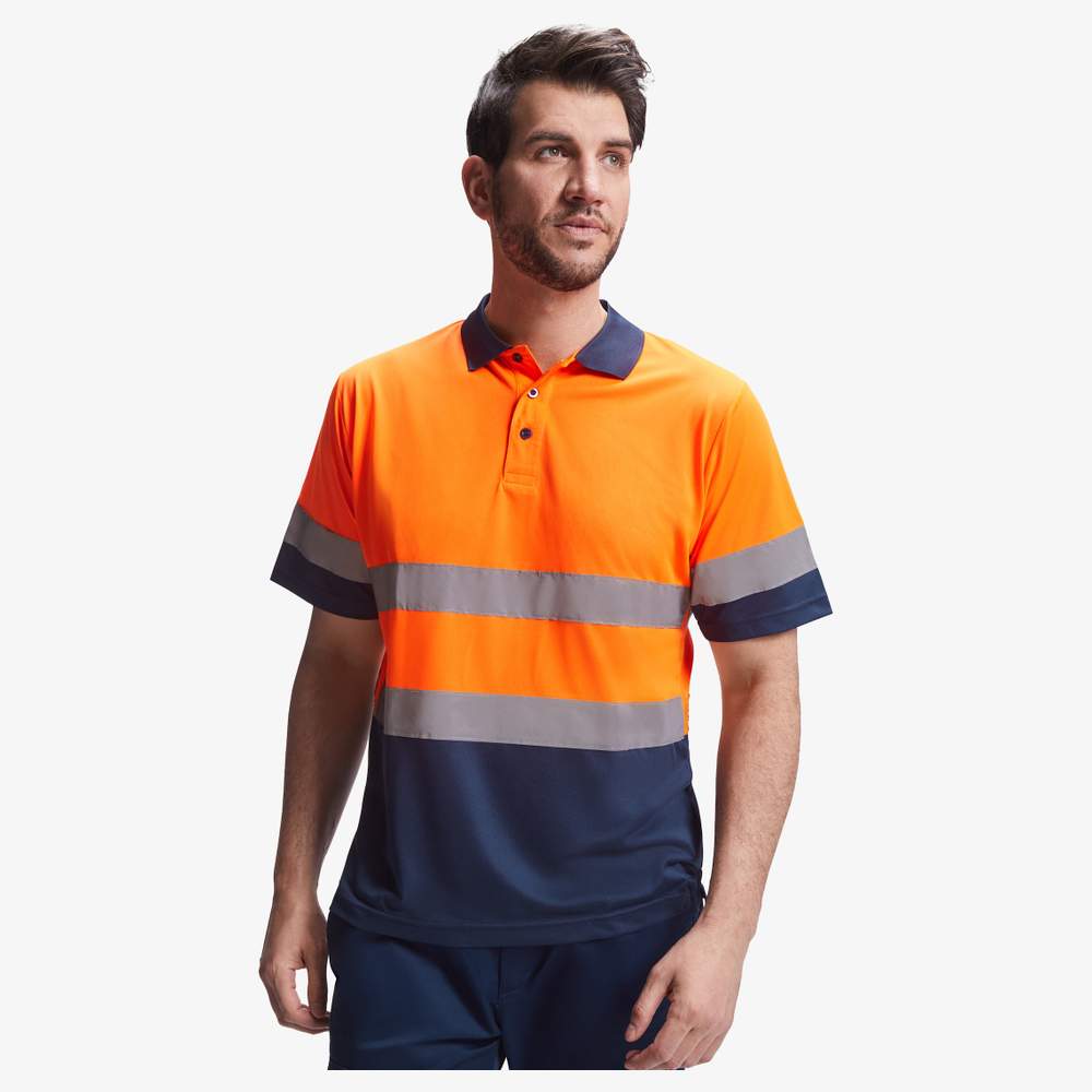 High visibility short sleeve technical polo. Button placket with 3 buttons. Ribbed collar and cuffs. Two horizontal reflective strips on the chest and sleeves. Anti-snag fabric. CE certified according to EN ISO 13688:2013/A1:2021, EN ISO 20471:2013/A1:2017 standards. Class I: 55221 - 55223 - 52221 - 23221. Class II: 221. Detachable labels.